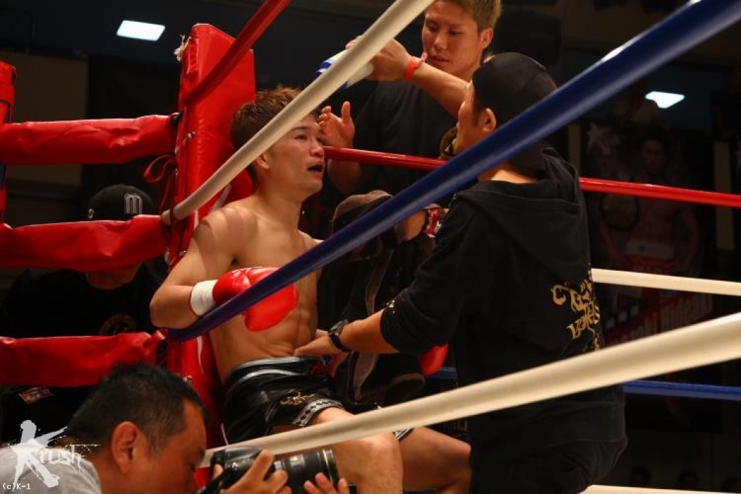 2R、離れた間合いから威力ある右ストレート、右ローを打ちつけていく明戸だが、郷州は直撃させず、逆にアッパー・フックを交えた4連打から右ローと攻撃を明戸に見舞う。試合は我慢比べの様相も呈するが、郷州の左ボディフックと右ローに明戸はダメージが見え始める。
