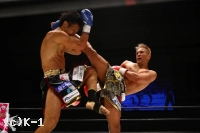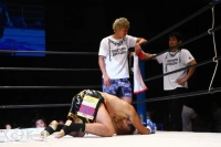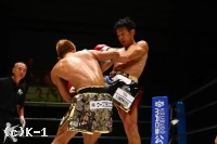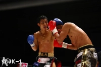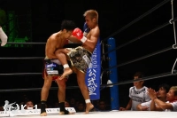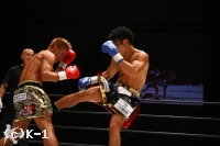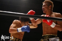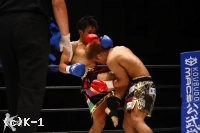 2R、小澤はミドル、横蹴りを入れ、大岩が詰めてくるとクリンチして抑える。接近戦で大岩はボディへのヒザを突き上げる。1Rより小澤に対し距離を詰めるのに成功している。そしてノーモーションでの右ストレート、さらに離れ際の右ストレートと大岩はヒットし、小澤はこれが効いてバランスを崩す場面が見られる。しかしラウンド最後は小澤もフック、ストレートを振るって大岩に迫って終える。