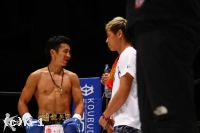 「お忙しいなか名古屋まで、東京から来てくださった方ありがとうございます。(小比類巻)会長、毎日ミットありがとうございます。小比類巻道場のみなさんも、俺どんどん上に行くのでお願いします。いまチームドラゴンの大岩選手をぶっ飛ばしたんですけど、俺がほんとにぶっ飛ばしたいのは武尊、おめぇだ。俺もっと強くなるんで、格闘技に懸けているので、俺には格闘技しかないので 絶対ぶっ飛ばすのでお願いします」