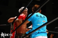 「新しくチームドラゴンに移籍した東本央貴です。応援の数は負けてましたけど、その人たちの力もしっかり僕の力になったと思います。いまセコンドの(佐々木)大蔵くんがKrush-63㎏のチャンピオンなので、なかなか挑戦するのは難しいと思うんですけど、とりあえず僕がいつでも挑戦できるよう常にトップを走っていきたいと思います。それかK-1の-62.5㎏に行けるように頑張っていきたいと思います。まだまだ全然未熟ですけど、応援よろしくお願いします」