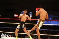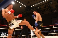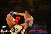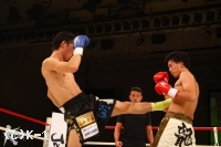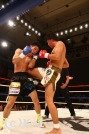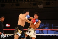 2R、ジャブで前進した松野は近距離で顔面面へのヒザ蹴りを放ち、これで佐野の鼻から出血を呼ぶ。しかし佐野も接近戦でヒザを返す。松野は近距離の展開に分がありと見たか、どんどん間合いを詰めてヒザを放っていく。だが、佐野も負けじと松野のボディにヒザを飛ばす。