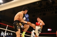 立ち上がった松野を佐野はさらに左三日月蹴り、前蹴りと打ち込んで追っていく。松野は前蹴りを入れ、フットワークで距離を取り、1Rを終了する。