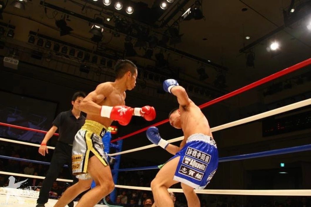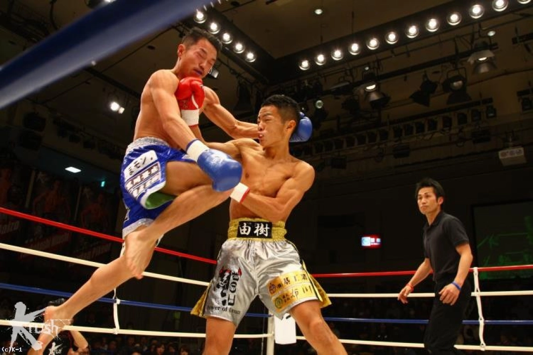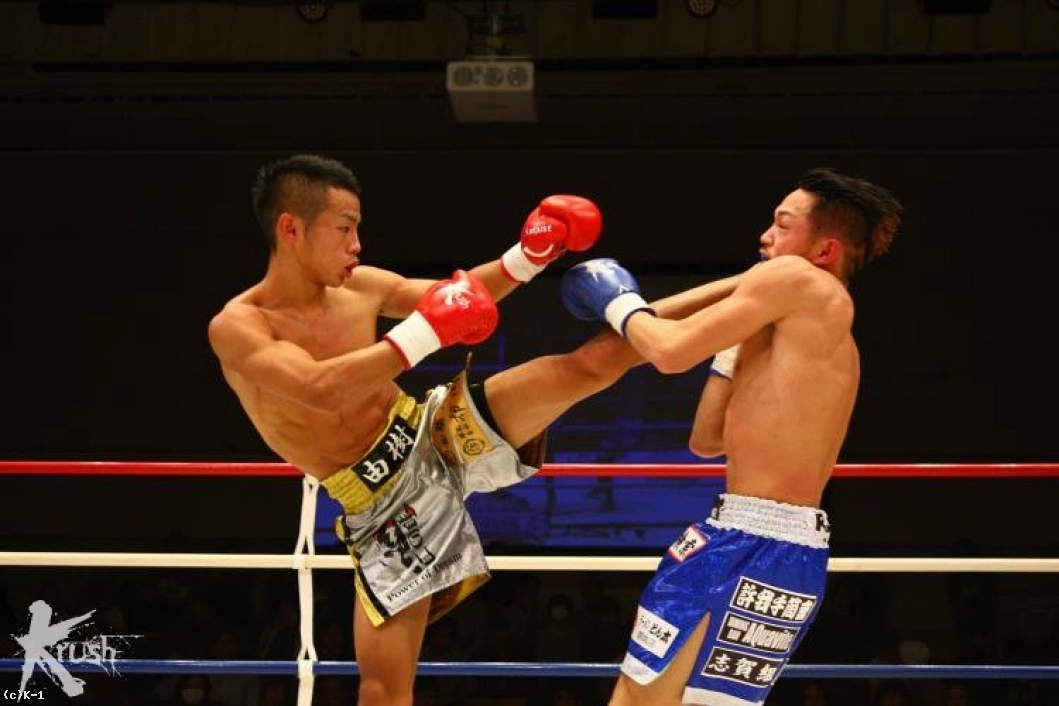だが、隆聖も押されながらもダウンを奪った跳びヒザを繰り出す。武居は左の蹴りをミドルとハイで蹴り分ける。