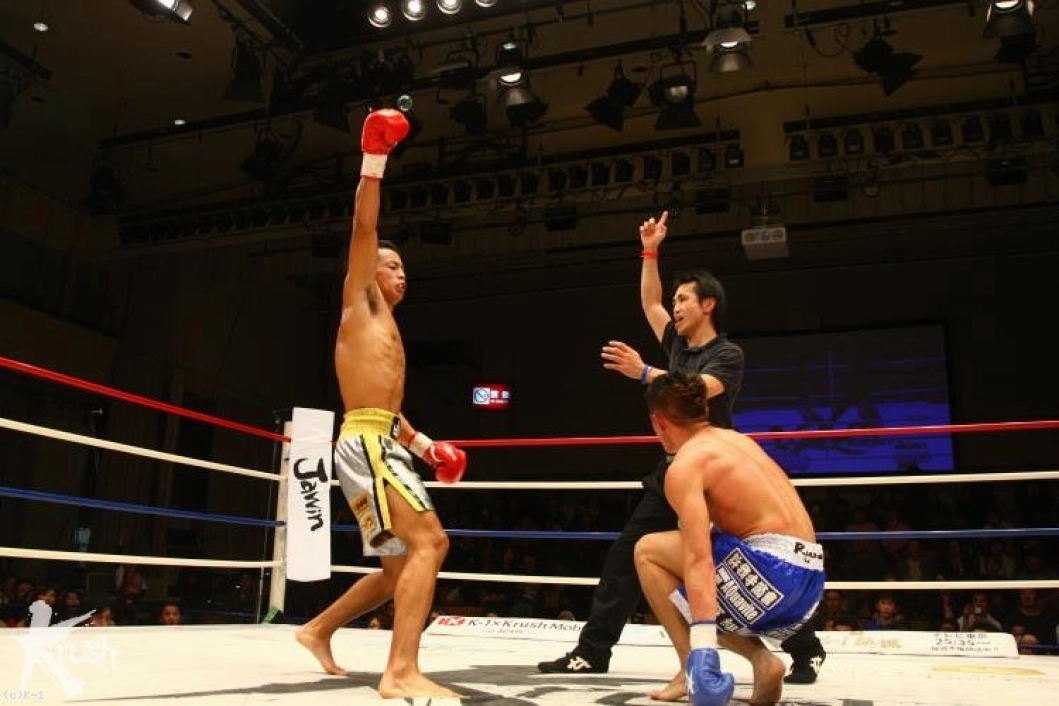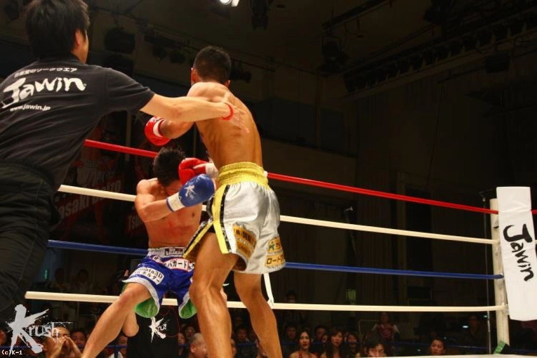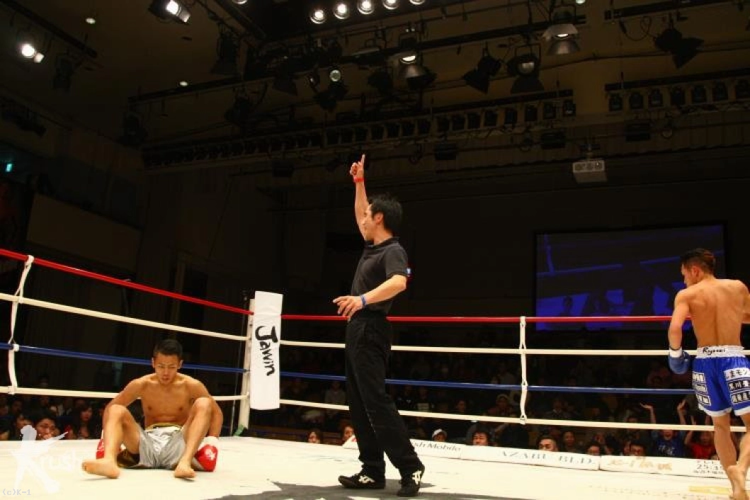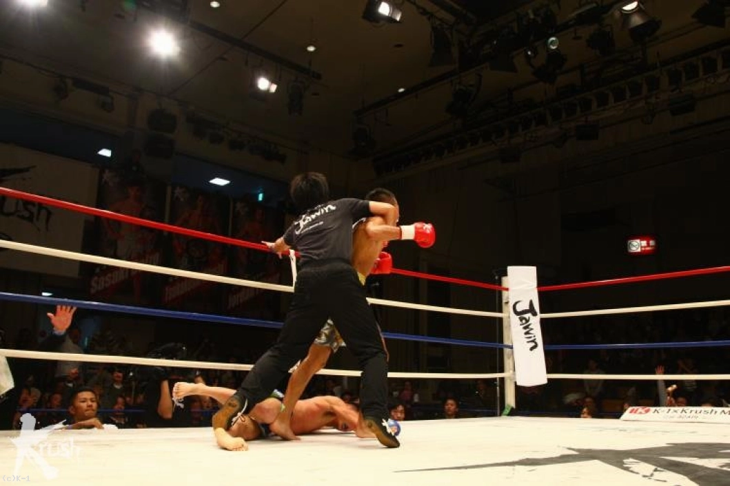 再開されると武居は攻勢を緩めず隆聖を押していく。そして左ストレートから左ハイを打ち込み、隆聖はこれにバランスを崩してダウン。立ち上がった隆聖に武居は顔面前蹴りを決め、これで2度目のダウンを奪う。