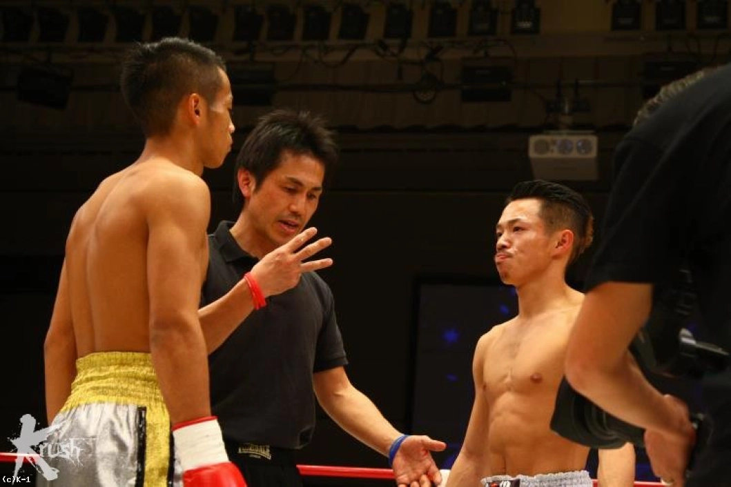 3R 、武居は前に出て右フック、左ストレートに鋭いミドルを織り交ぜる。武居が隆聖を押していくが、隆聖も右ストレートを打ち返す。だが、武居の左ストレートがクリーンヒットする。さらに武居は左ストレートを見舞い、右顔面ヒザと隆聖を追う。しかしここで武居の放った蹴りがローブローとなってしまい、一時中断。