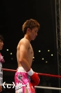3R、やはりプレッシャーを掛け、西京をロープ際に詰める朝久。西京はワンツー、跳びヒザと放つのだが、朝久は一瞬止むことはあっても、すぐにプレッシャーを戻し、ロー、左右フックと西京を襲う。西京はこれにステップインしての左ストレート、左ミドルで応戦する。