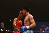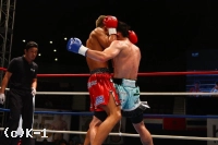 3R、和氣が2R同様前に出て上田に迫る。だが、そのプレッシャーを上田はフットワークで受け流す。左右ストレートで切り込む和氣。だが、やはり上田はブロック、横へのステップでこのプレッシャーを受けない。上田が前に出てきたところに和氣は右クロス、左フックと当てて下がらせ、上田が放ったミドルの直後に右ストレートをリターンすると上田が手をつくようにダウン。この直後に試合終了のゴングとなる。