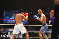 2R、功也はプレッシャーを落とさず、ベノーイにロープを背負わせ、そこを右ジャブ、左ストレート、左クロスで襲う。さらに左ボディストレートも出し始め、ベノーイを攻める。