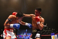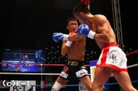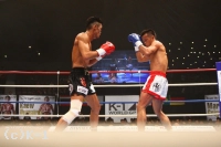 2R、横へのステップとジャブで郷州を止めんとする高橋だが、郷州は止まることなく、前に来て右ストレート、左フックを打ちつける。郷州は1Rより間合いを詰めることに成功している。