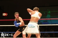 さほどダメージはなさそうなKANAだが、メロニーの方がパンチの回転が速い。KANAはしかし落ち着いて左インローを打ち込む。だが距離が開くとメロニーも左ミドルを打ち込んでくる。KANAはメロニーのパンチに目が慣れてきたか、ジャブをかわしながらバックブローを当てダウンを奪い返す。