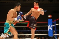 2R、川口は距離を取って右の蹴りをミドル、ローと当てていく。しかし秋元はこの蹴りの切れ間に左強打を振るっていく。前に出る勢いの落ちない秋元は跳びヒザから左ストレート。秋元はガードを下げ、両手を広げる古武道のような構えからも左ストレートを伸ばしヒットを上げる。