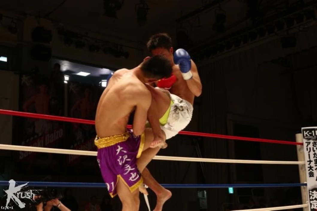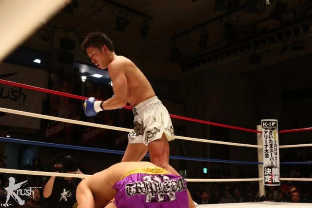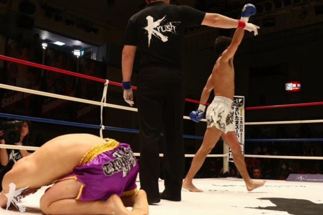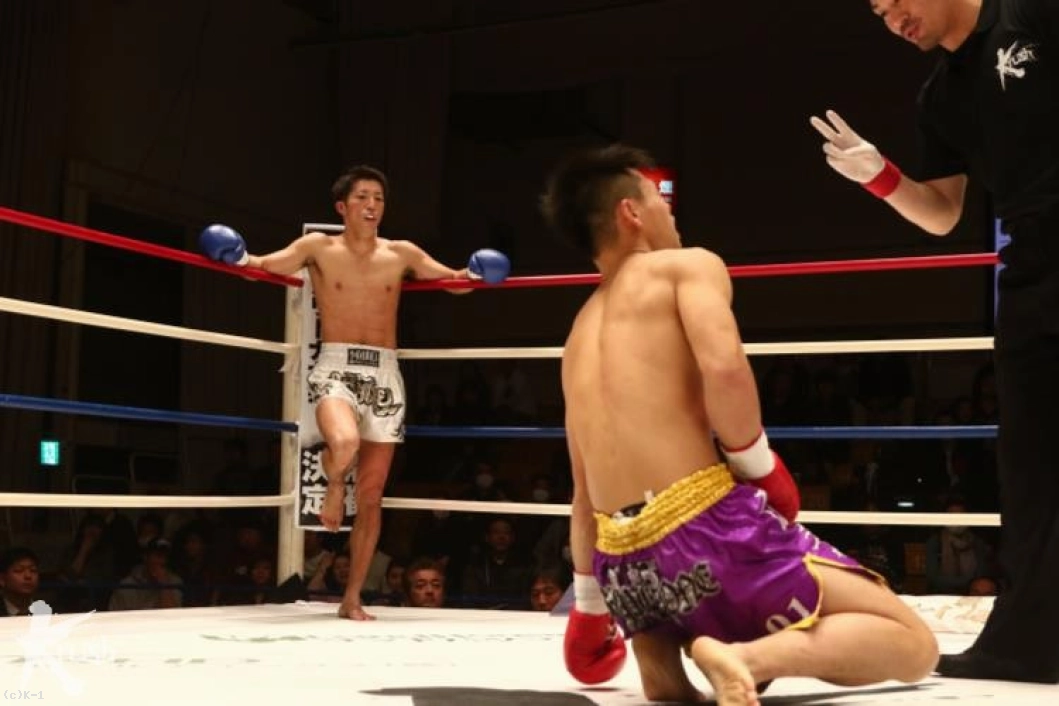 3R、ダウンのビハインドがある小久保は距離を取って立つのではなく、どんどん前に出てボディパンチで鍋島を押していく。しかしここで鍋島が再びヒザをボディに突き刺しダウンを追加。小久保は立ち上がるも、鍋島は今度は跳びヒザを顔に決めてダウンさせ、ノックアウトを決めた。