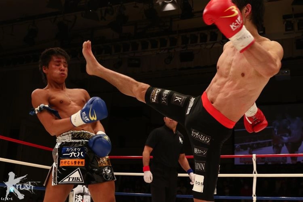 3R、出貝は再び手の平を向けながら軍司に向かい、ボディに後ろ回し蹴り。これが効いたようにも見えた軍司だが、逆に左ボディを出貝に返す。そして前蹴りを胸に決め、大きく出貝を後退させる。出貝も右スーパーマンパンチを繰り出すが、軍司は当てさせず、ボディフック、ヒザ、ハイキックとグイグイ前に出る。