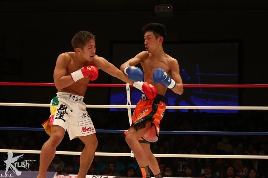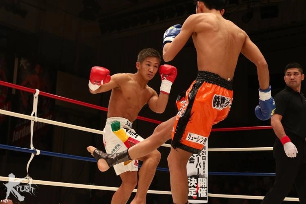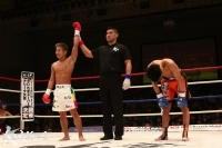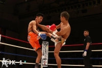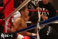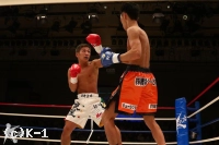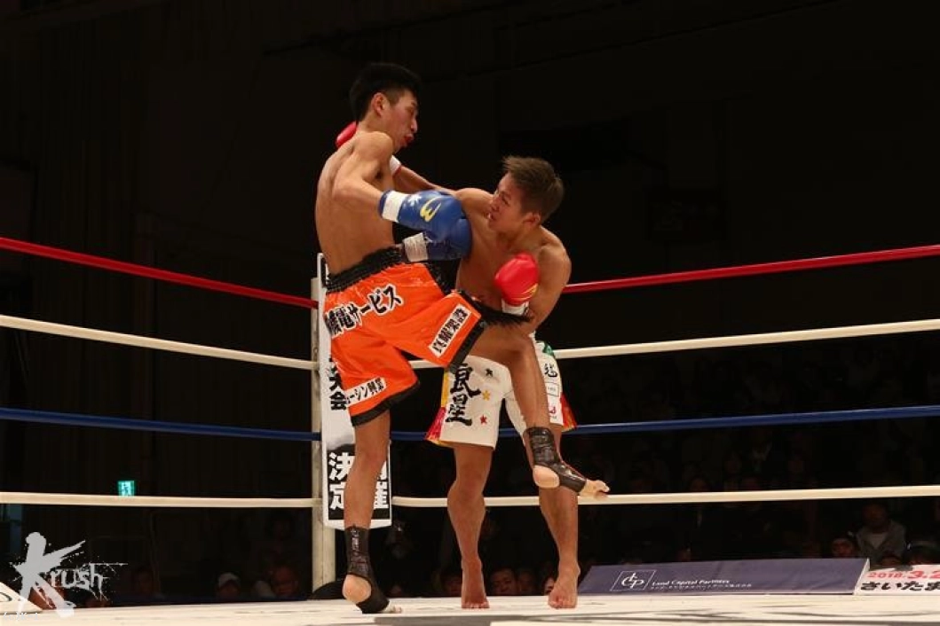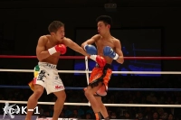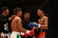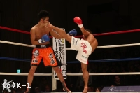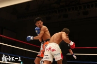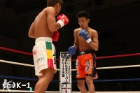 2R、良星は左ミドルを放ちながら貴章に向かい、オーソドックスに戻ると右ローで貴章を転倒させる。だが、立ち上がった貴章は長身を活かした深い懐で良星の進入を妨げ、攻勢を受けない。良星はステップが軽快でジャブからロー、かと思えばバックブローと見せるが、貴章も同じバックブローを返す。スピードを活かし攻め入らんとする良星だが、貴章の高身長と深い懐をまだ攻略には至らない。