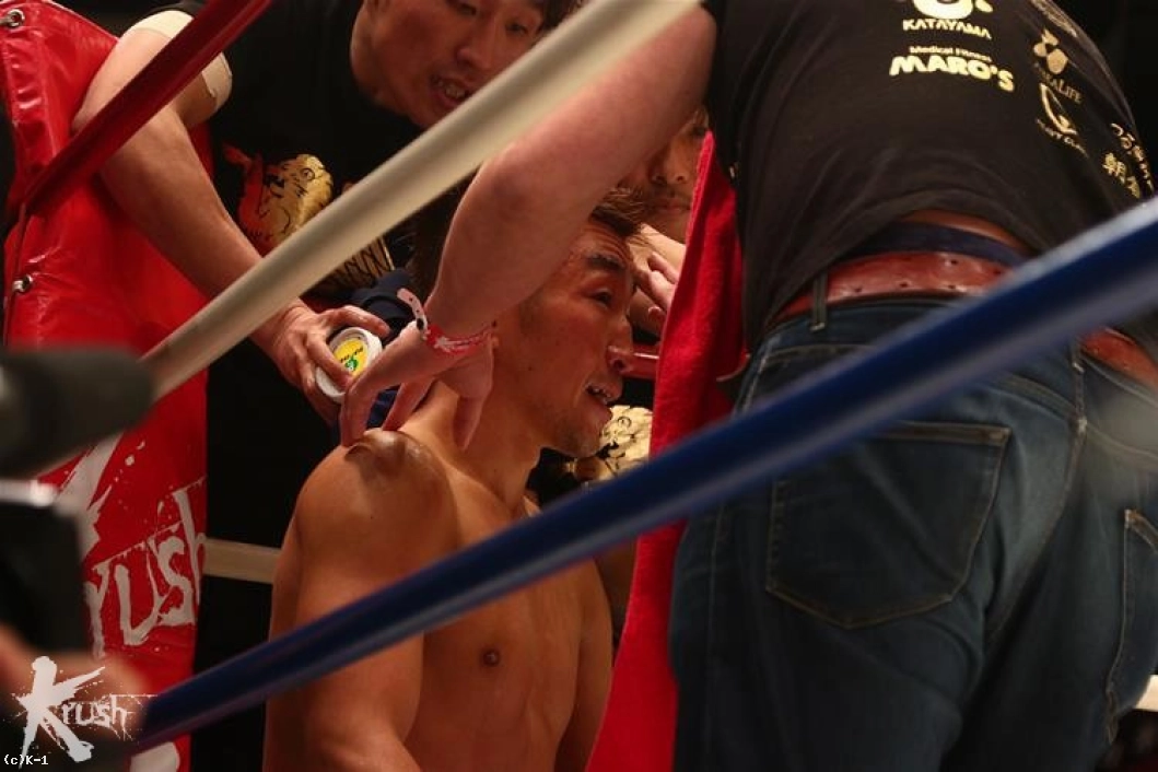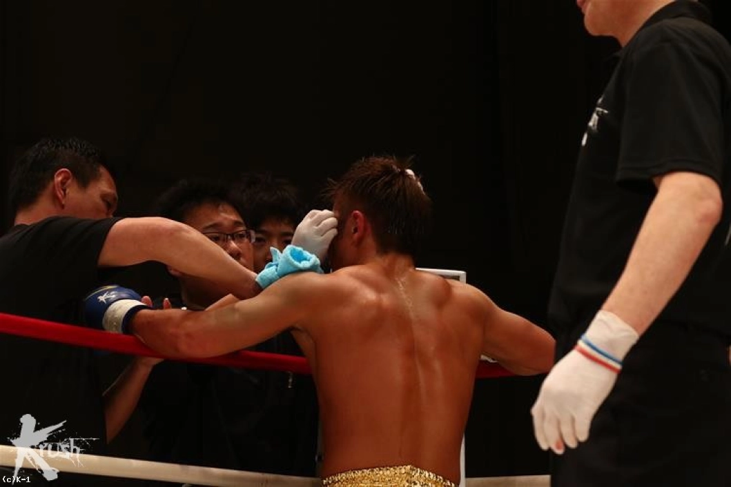 3R、中澤の右ローにややダメージを見せる小宮。中澤は跳び蹴りも見せ、さらに右ローキック。小宮がプッシングで下がらせようとしても下がらず、中澤はやはり右ローを浴びせる。やや中澤の押す場面が目立ち始めたところだったが、小宮にバッティングがあり、中澤はこれで左目周辺から出血する。再開すると前に来る小宮に対し、中澤は目に入る血をぬぐいながら応戦。やや視界が悪いか小宮が右ストレートを当てて前に出て、そこから攻める。