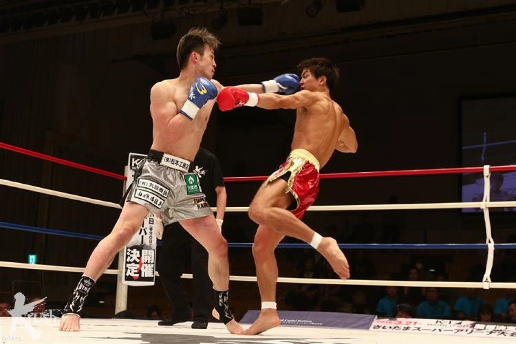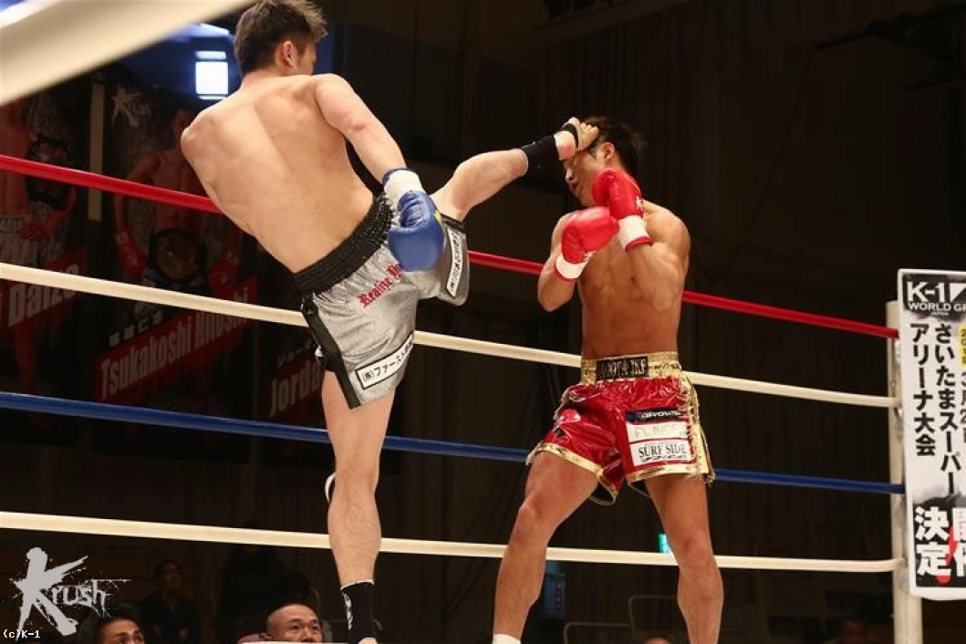 1R、蔵人はサウスポー、高下はオーソドックスで、蔵人の左ミドルに高下は右ローを返してジリジリと蔵人を押していく。しかし蔵人も距離を掴んで左の蹴りをミドル、ローと蹴り分ける。蔵人の左ミドル、左インローを受け、右腕と左内股が赤くなる高下。パンチを狙い距離を詰める高下だが、蔵人もパンチを打ち返して下がり、距離を詰めさせない。