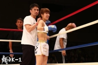 「(試合を振り返って?)思ったよりローが強くてびっくりしましたが、ずっと前に詰めていく練習をしていたので。中に中にと入っていけたと思います。(相手のLittle Tiger選手は格上だったが?)始まる前には格は関係ないと言ってましたが、初めての格上で緊張はありました。でも、勝てないとベルトは見えないと思ったので。勝ててよかったです。(今後の目標は?)-45kgのベルトを作ってもらって、私が初代チャンピオンになりたいです」