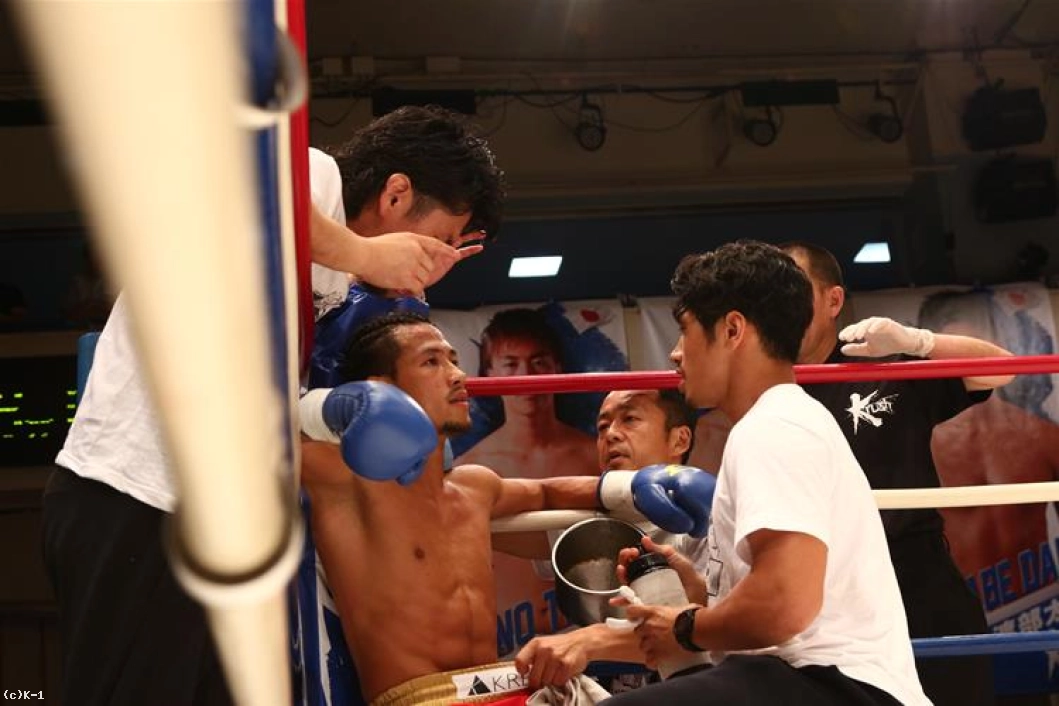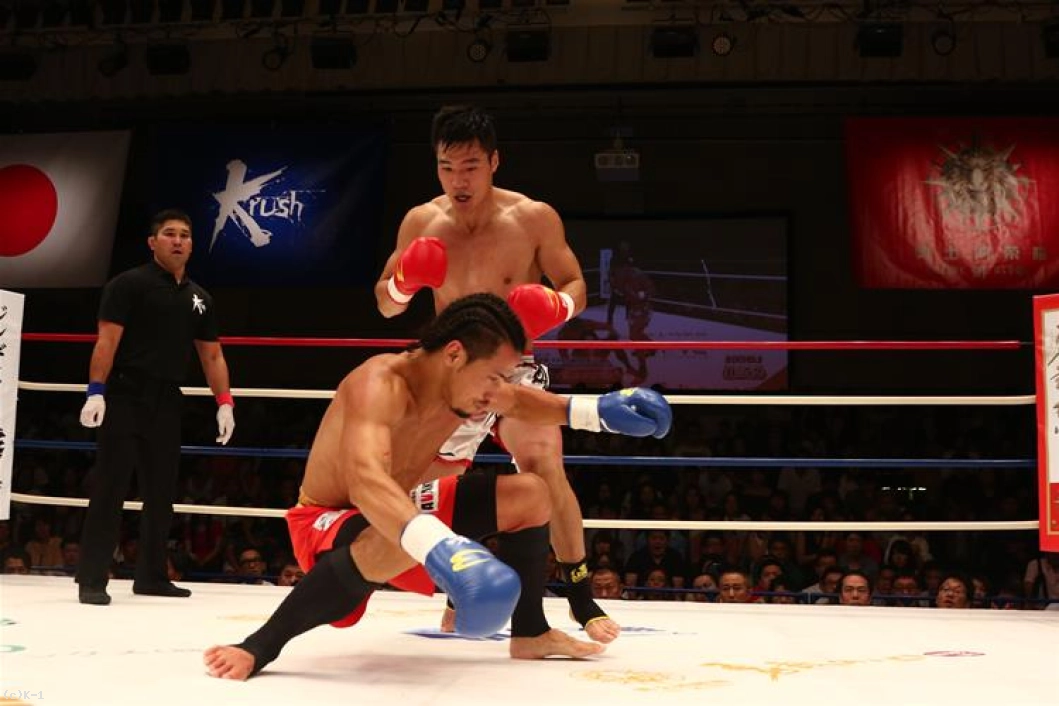 2R、ジュンフェンが左フック→ストレートで切り込み卜部は転倒するが、これはスリップダウン。