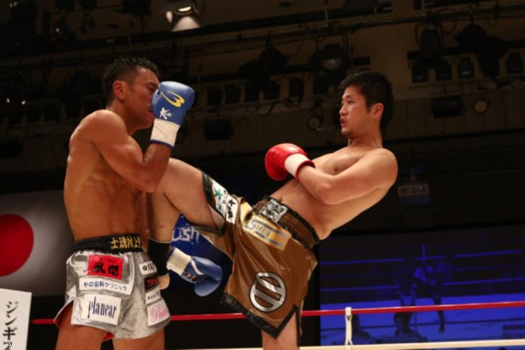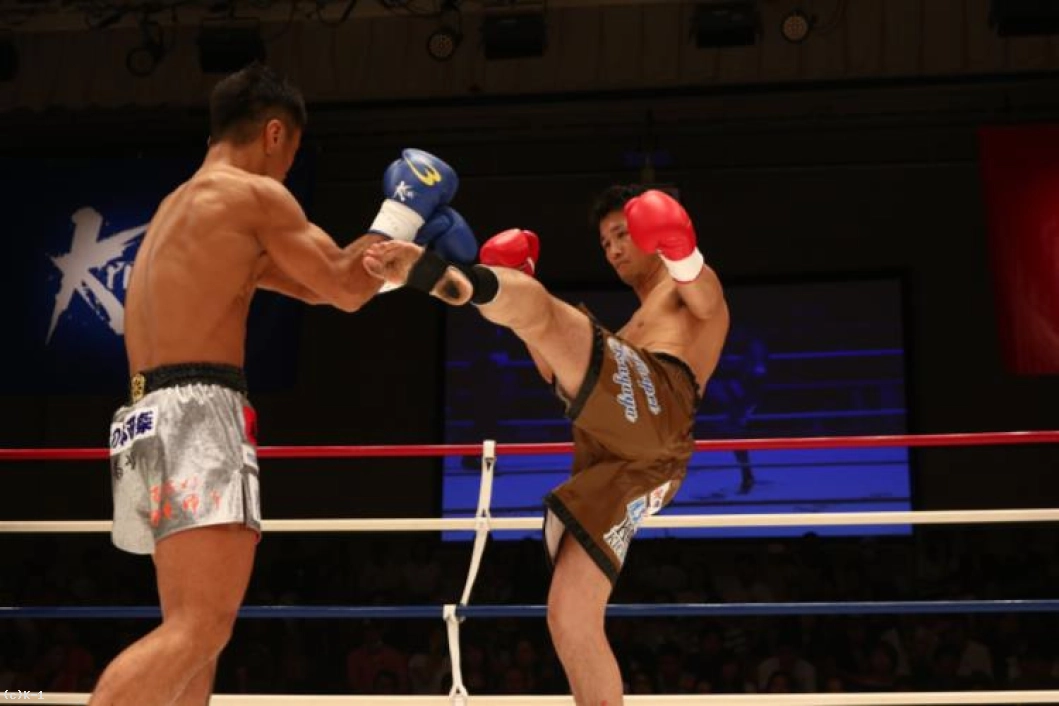 2R、恭士郎は歩きながら前進ベースの戦いで、青津のジャブ・ストレートをガードで弾いて下がらない。そこから左ボディフック・ストレートとパンチをまとめ、さらにローキックへ繋げる。