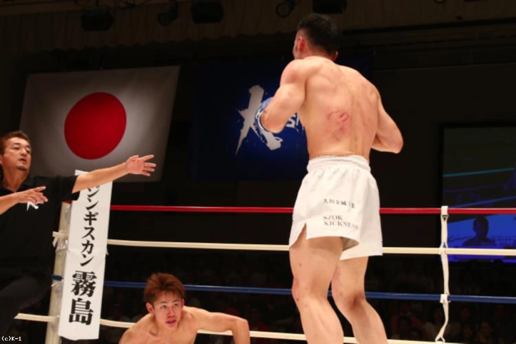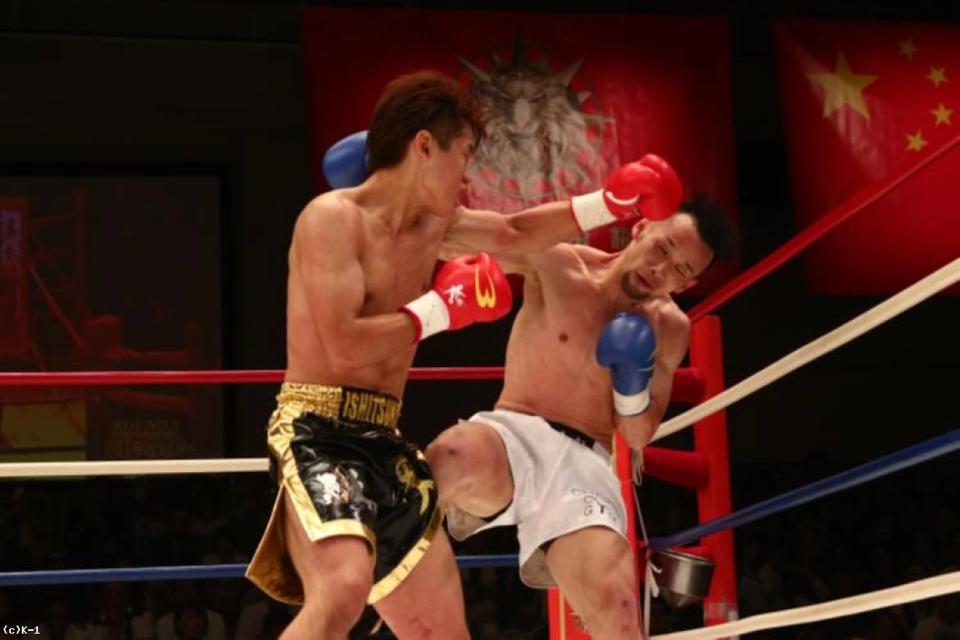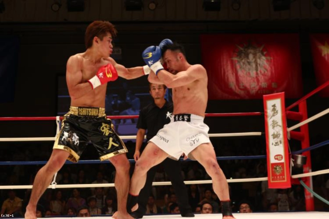 2R、右回りをして左ミドルを当てていく大川だが、石塚は後退せずのっしのっしと前に出る。