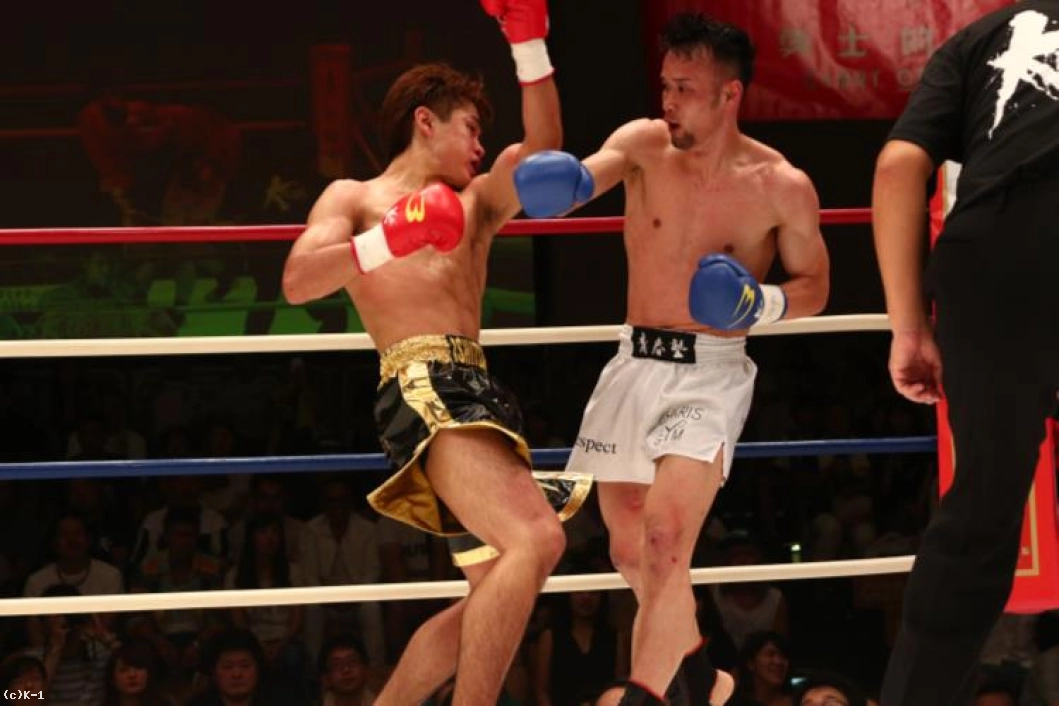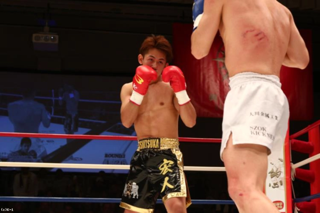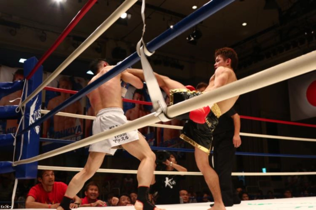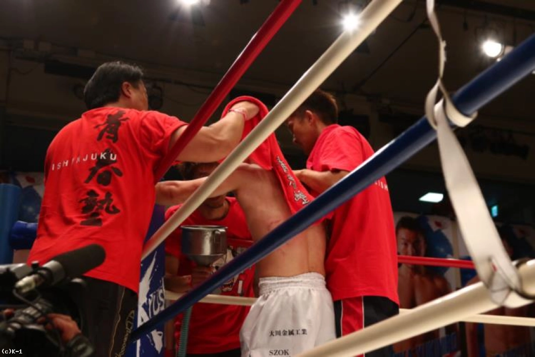 3R、石塚は右ハイ、ボディへのヒザとプレスを掛けるが、大川も左右のフックを振るい、間合いを開ける。