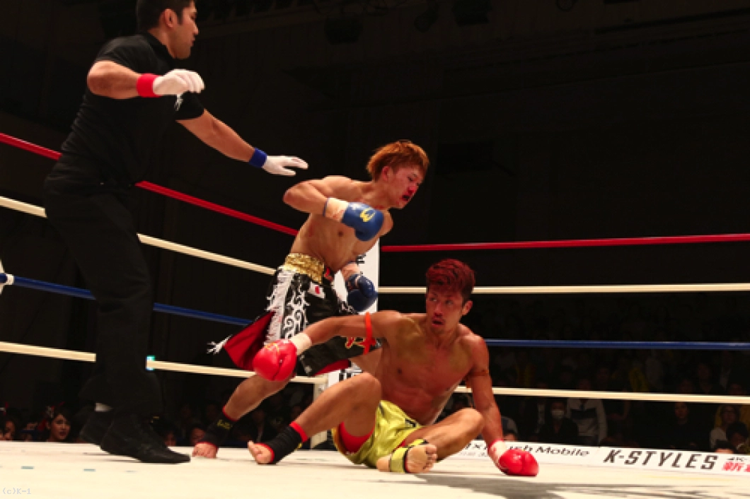 3R、闘士はリングを右回りして横山をいなしていく。闘士が右ストレートを当てるが、横山もバックブローを当て、そこから大きな前蹴りで闘士を1Rのように転倒させる。立ち上がった闘士は距離を詰めていき、打ち合いに臨む。闘士がスリップしたところに横山はパンチを見舞ってしまい、レフェリーから口頭注意が与えられる。