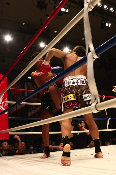 2R、海斗は右ジャブを先行して左ミドルを繋ぐ。そこから繋ぐ左ストレート、右フックがとらえてきて雄人は下がり出す。逆に前に出んとする雄人だが、海斗は左ミドルをタイミングよく打ち込み、雄人が前に来ると横へのステップで体をかわす。海斗は左ストレートと右フックを繋いで前進。雄人も右ストレートと左フックで応戦するがやや押され気味。