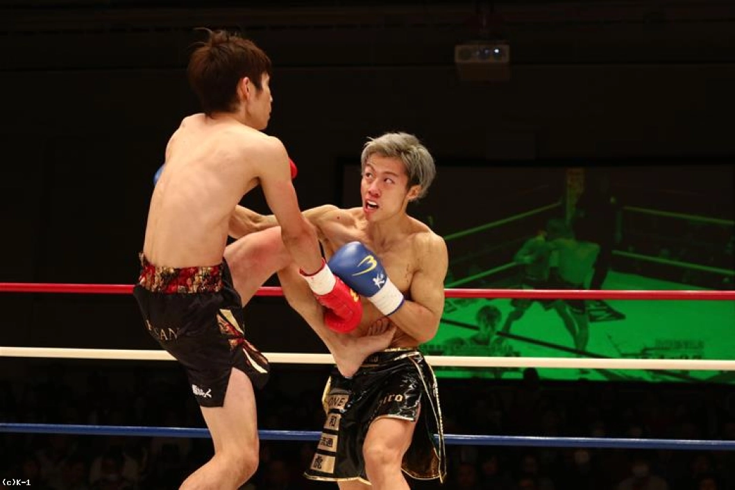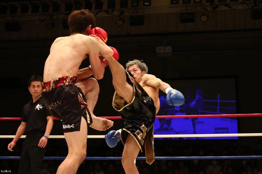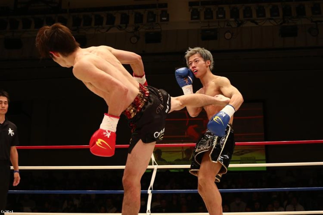 2R、出貝はボディ&顔面への前蹴り、金子は左右のミドルを放ち両者距離を探り合う。そして互いに自分の懐へ相手を入れない。出貝はバックブローを放つが、これは金子がブロック。しかしその後の顔面前蹴りは金子をとらえる。出貝は次第に試合運びにキャリアを見せてきて、バックスピンキックからストレートで前進。金子の顔面をとらえていく。