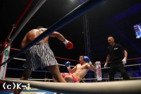 2R、変わらずフルスイングのモハンだが、山際が下がったところを伸びのある右フックでとらえてダウンを奪取。立ち上がるもフラつく山際に、2度目のダウンとKOを迫ってフックを左右またもフルスイングしていく。しかしとらえることができず、モハンは疲れをにじませる。息を整えながらストレート、フックと振るっていくモハン。ローから右・左とフックを振り回すも山際をとらえられずにいたが、終了間際に振るった左フックで最後に山際をとらえてバタリと倒し、KOで決勝へ進んだ。