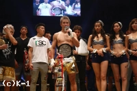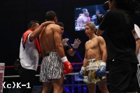 (木村選手が勝ち上がってきたら?)もう、やりたくないです(苦笑)。やっぱり、知っている選手はどこかで躊躇しちゃって。いま、頭が真っ白状態なんですけど、コレを背負っている時点でヘタな試合はできないという気持ちもあるんですけど、練習がつらすぎて燃え尽き症候群になってます。(K-1のベルトは?)K-1に夢を与えてもらって、17歳の頃にプロデビューして。このベルトを負けたというのは幸せです。とても重いですね。(ファンへのメッセージを)今日は応援していただいてありがとうございました。たくさんのかたに来ていただいて。ベルトを取ったからには、またイチからがんばりたいので、また応援よろしくお願いします」