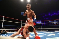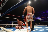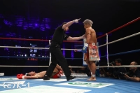 3R、小宮山は前蹴りで武尊を下がらせてから顔面への後ろ回し蹴り。しかし武尊は笑みを浮かべて前に来る。小宮山がボディストレートに来ると武尊はそこへヒザを合わせる。さらに距離を詰めてきた武尊はボディへのヒザ、ボディフックと見舞い、小宮山はこれに観念したように倒れる。立ち上がった小宮山に武尊は左右のフックから左ミドルで2度目のダウンを与え、最後もフックで打ち倒して3階級制覇を成し遂げた。