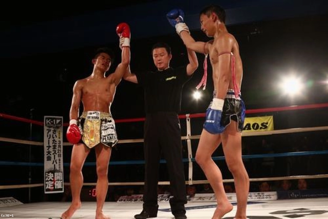 3R、構えをサウスポーにスイッチする泰輝。中澤は左右のボディを打ち込む。泰輝は距離を取ってミドル・ローを蹴る。パンチで前に出る中澤、ヒザ蹴りで迎え撃つ泰輝。残り30秒、泰輝がミドルとローを蹴り続け、中澤もボディストレートで反撃。互いにダウンを奪い合った一戦はドローに終わった。