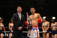 (対戦相手の印象は?)凄くタフだと思いました。狙われてる攻撃もわかったし、今日は凄くいい意味で冷静すぎたと思いました。自分の狙った攻撃がきれいに入ったっていうのもあったので。あと、自分のバランスが悪くてこけたりしちゃったんですけど。今日は左ストレート、クロスがいい角度で入ったので、それで倒せるように改良していきたいと思います(今後の目標は?)僕、31歳で、キックを始めて14年目になってきて、もう集大成だと思ってるので。次のタイトルマッチが自分にとってラストチャンスなのかもしれないし、そこで俺のキックは終わってしまうかもしれないけど。唯一獲ってないのがK-1のベルトだと思うので、それに向けて最大の努力をしたいと思います」