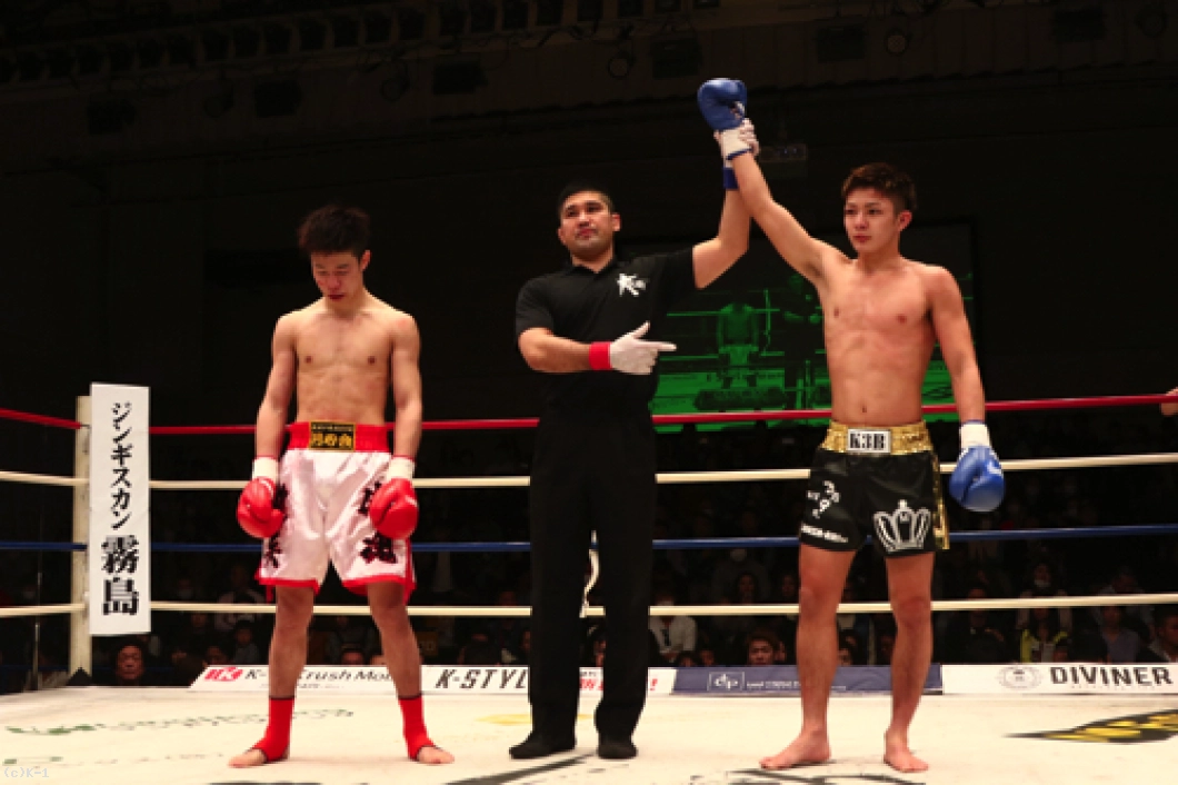 玖村はプレッシャーを掛けて出て右ストレートで椿原をとらえる。玖村はジャブを入れ、椿原の蹴りは見えてきたか当てさせない。そしてラウンド最後に再び相打ちのタイミングで右ストレートを打ち込み、椿原に2度目のダウンを与えて試合を終える。判定は30-26、30-26、30-26の3-0で玖村。新星対決を2度のダウンを奪って制した。