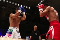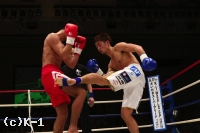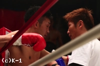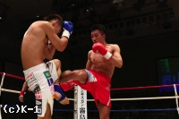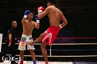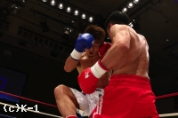 1R、伊澤は上段への後ろ回し蹴りをいきなり見せる。しかし神戸はこれをブロックして当てさせず、前蹴りと左右のフックを走らせる。だが、伊澤もガードをしっかり固めてこれを弾き、前に出てローを当てていく。神戸はロープを背負いながらフック、ハイキックで応戦するが、伊澤はボディフックを効かせ、そこから神戸をさらに攻める。神戸はしかしヒザ、前蹴り、フックと打ち返す。