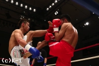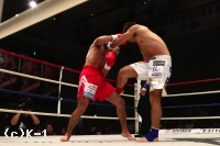 2R、伊澤はやはりガードを高くして前に出て正調ローキックにカカトでのローと神戸に浴びせていく。神戸はボディから顔面にパンチを走らせ前蹴りも打ち込むが、伊澤を止められない。伊澤はさらにスネ・カカトと神戸の脚にダメージを加えていく。ラウンド終盤には伊澤が胴回し回転蹴りの大技も見せる。