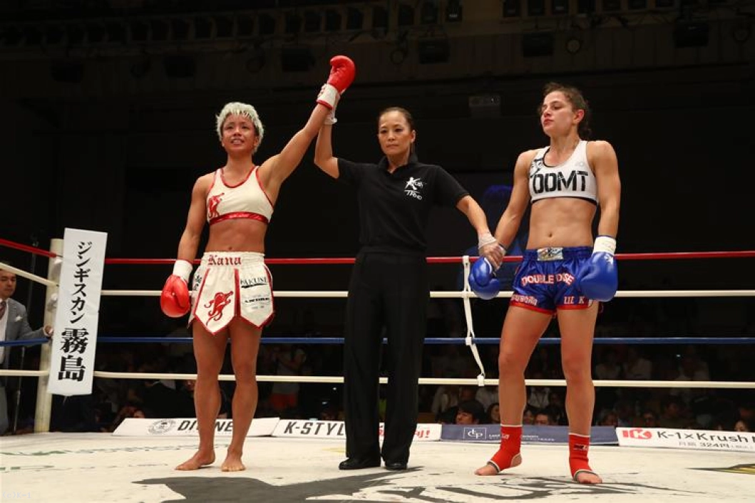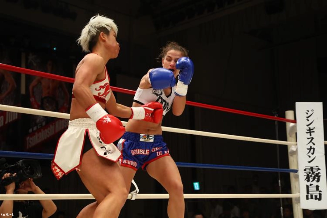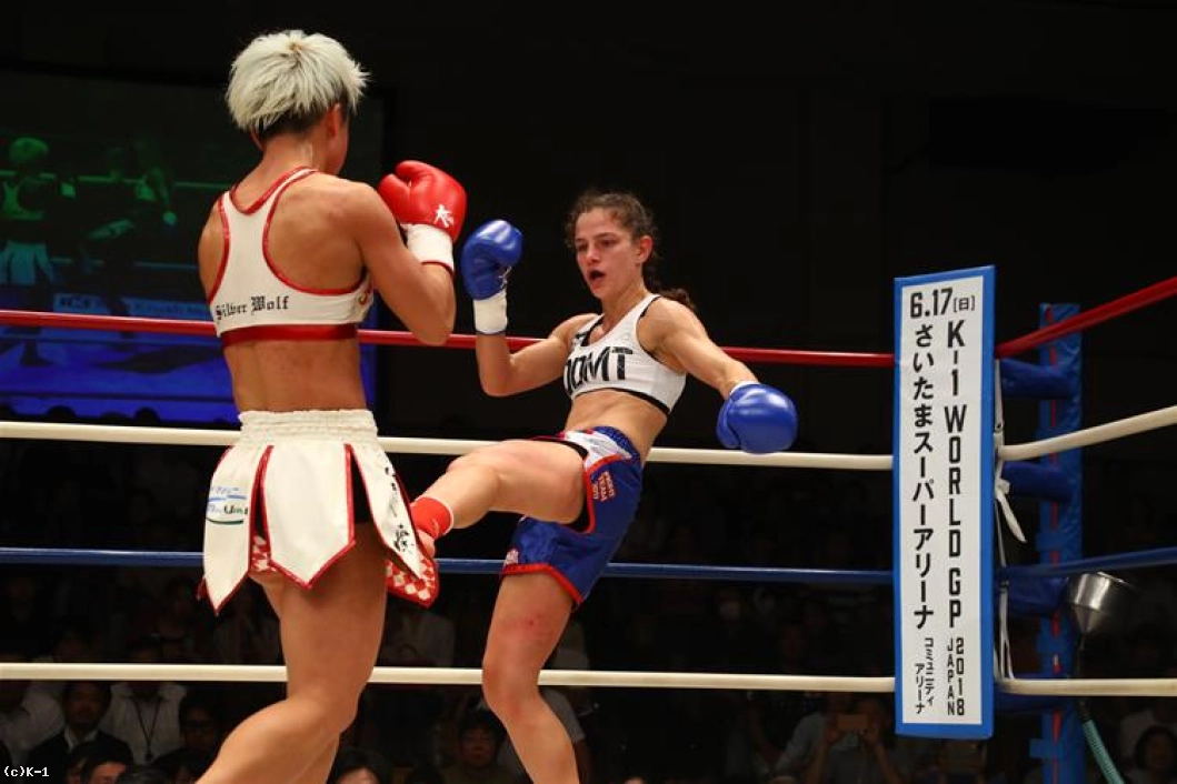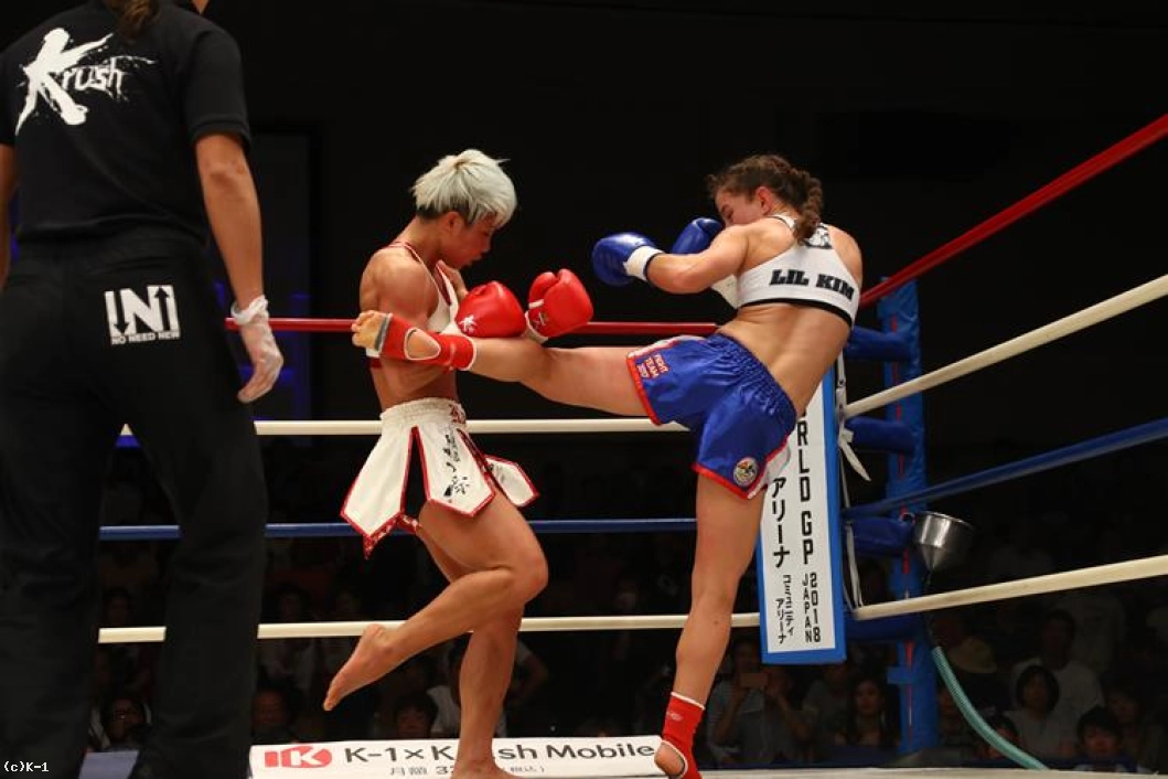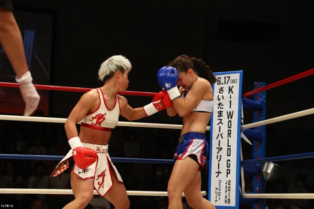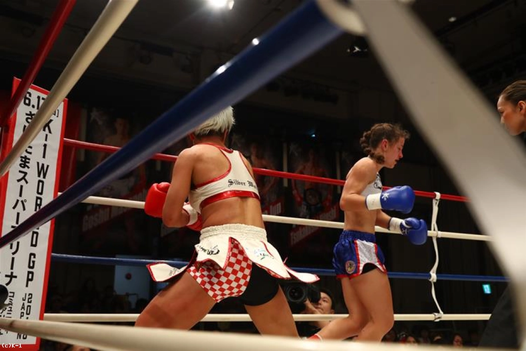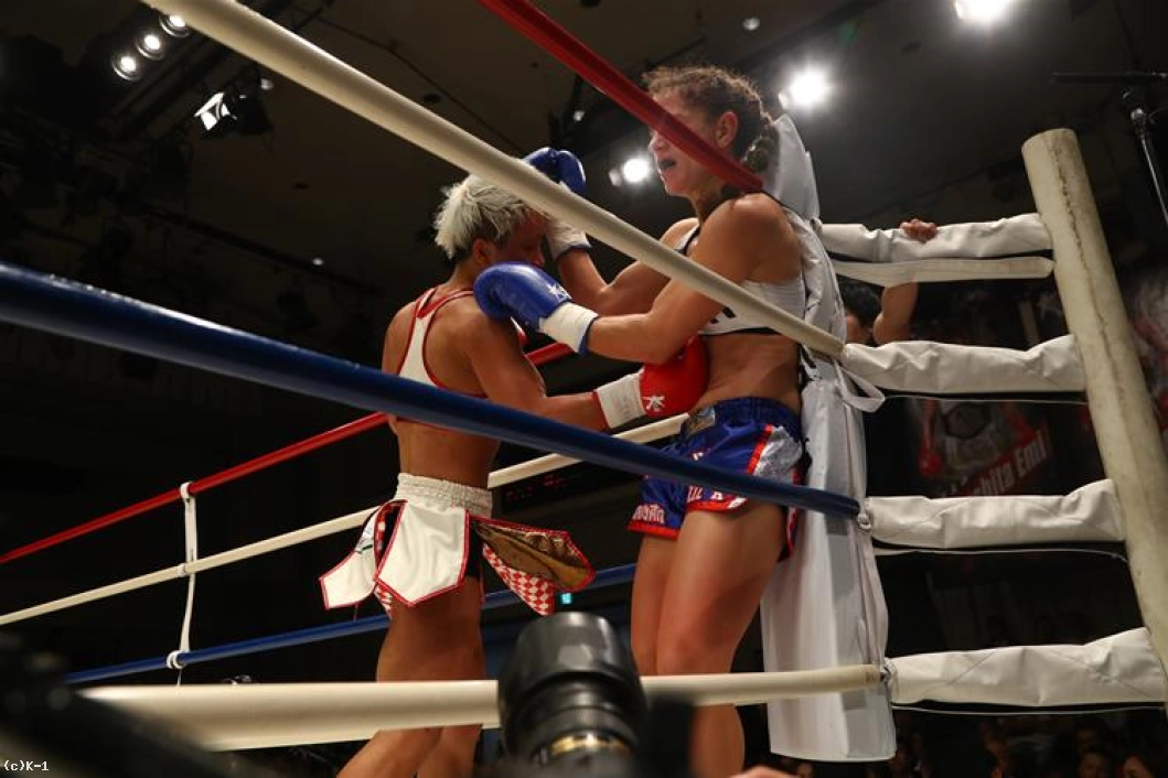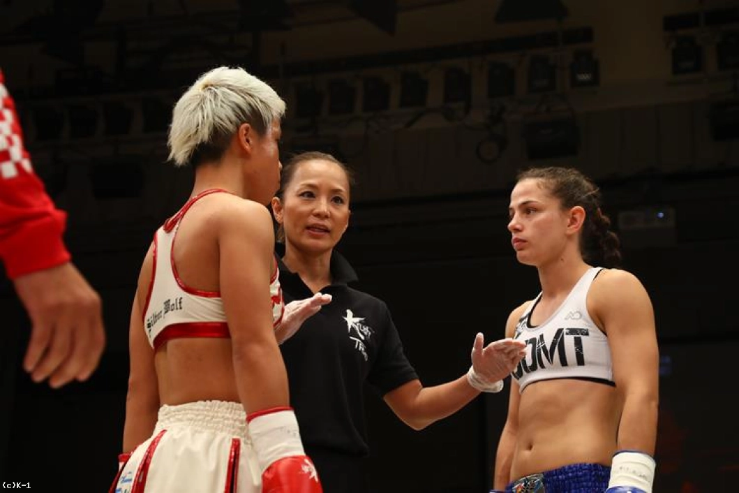 「(試合を振り返って?)楽しかった。とてもハイペースで疲れる試合だったんですけど、彼女はいい選手だと思う。(対戦相手の印象は?)とてもスピードがあって手数も多く、ガンガン前に出てくる強い選手だった。(今後の目標は?)次回戻ってくるときには体力つけて。ムエタイのクセが出ないように、もっとK-1ルールの練習をしっかりして出たい。(1Rのカウンターのパンチは狙っていた?)私は基本的に蹴り主体だけど、今回のパンチはラッキーでダウンを取れたのでよかったと思います」