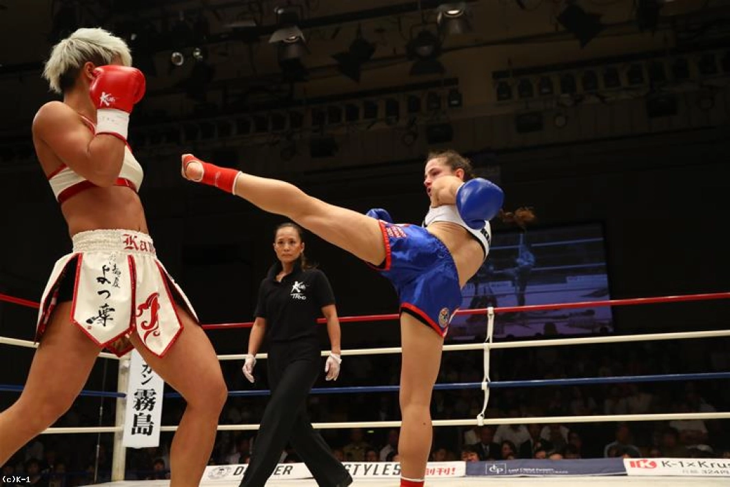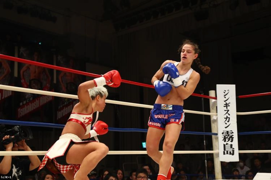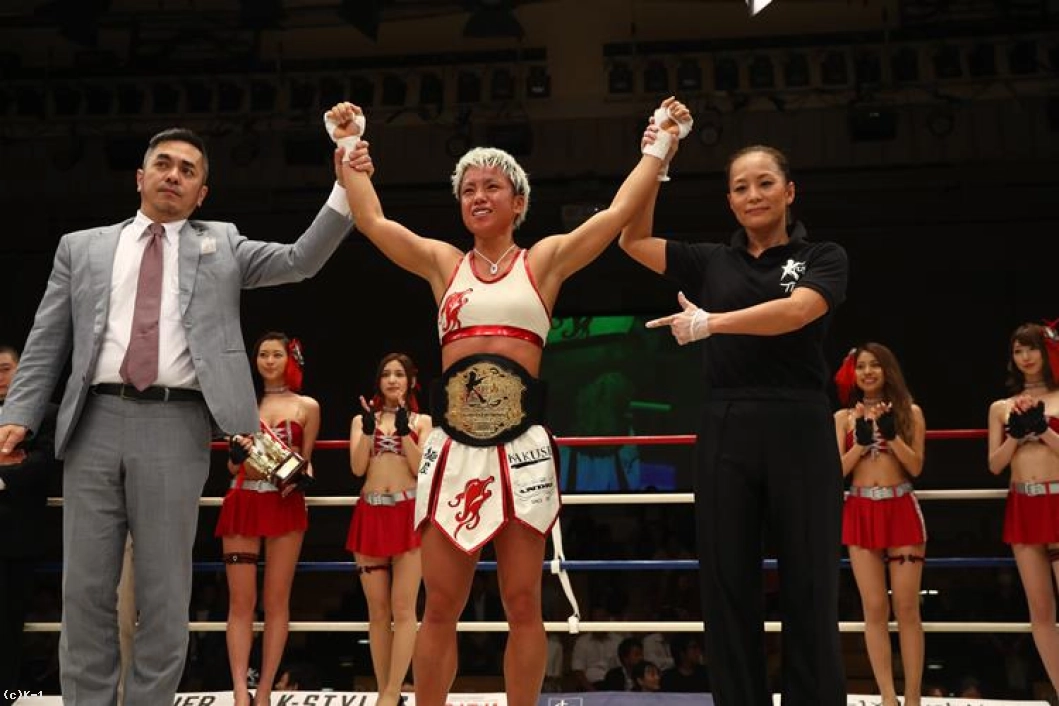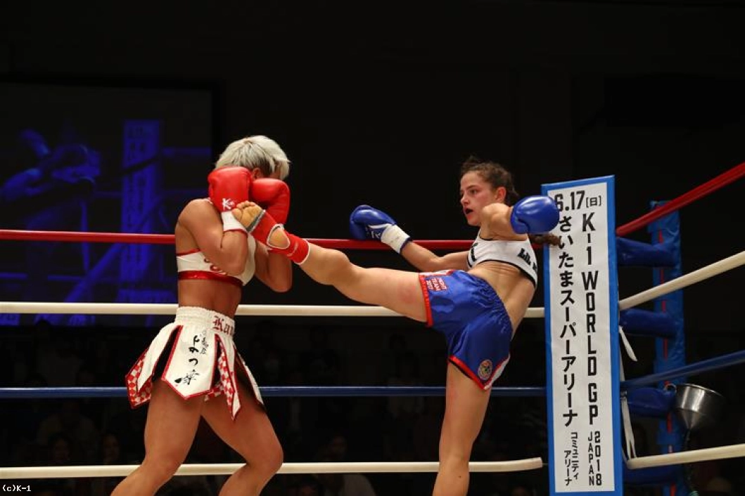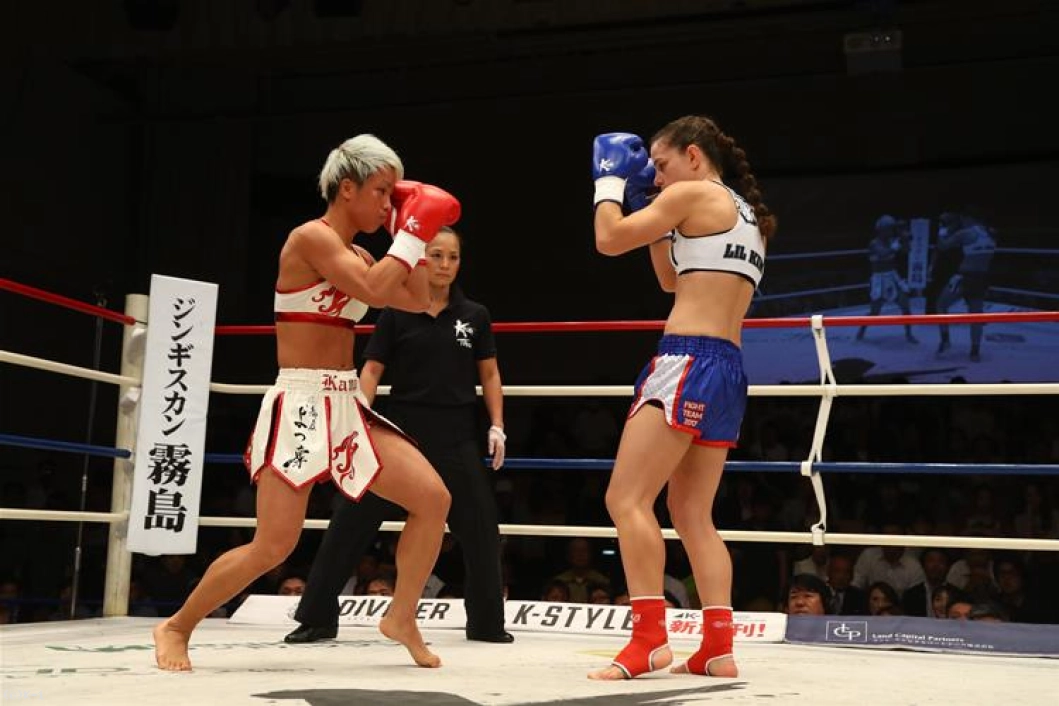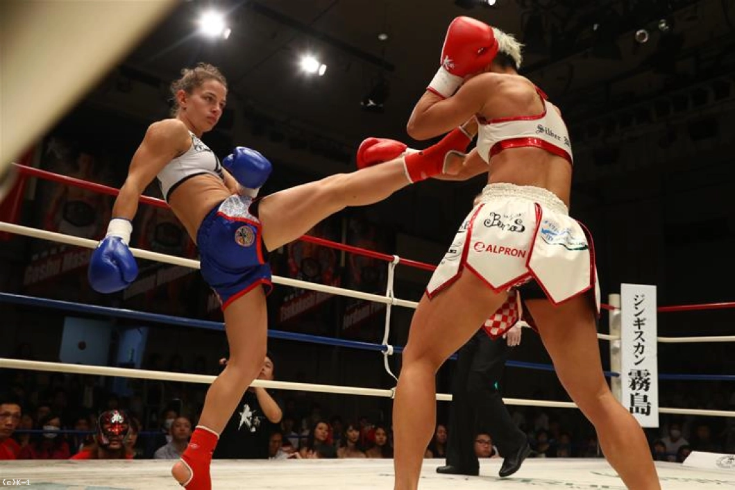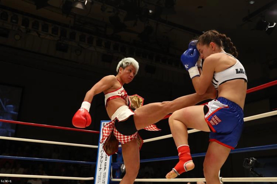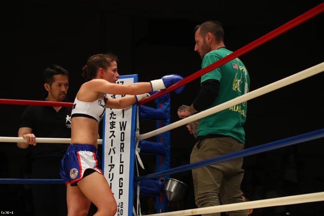 「(試合を振り返って?)楽しかった。とてもハイペースで疲れる試合だったんですけど、彼女はいい選手だと思う。(対戦相手の印象は?)とてもスピードがあって手数も多く、ガンガン前に出てくる強い選手だった。(今後の目標は?)次回戻ってくるときには体力つけて。ムエタイのクセが出ないように、もっとK-1ルールの練習をしっかりして出たい。(1Rのカウンターのパンチは狙っていた?)私は基本的に蹴り主体だけど、今回のパンチはラッキーでダウンを取れたのでよかったと思います」
