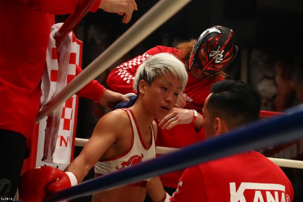 1R、ムエタイスタイルのタウンセンドは落ち着いた様子で構えて前蹴り、左ミドルを飛ばす。KANAはこの蹴りを腕で弾き、あるいはさばきながら前に出ていく。しかし左アッパーを振るわんとしたところに右ストレートを合わせられ、KANAは手をつきダウンを喫してしまう。タウンセンドは前蹴り、ミドルで距離を取り、それをかいくぐってKANAが入ってくるところに右ストレートを合わせる。