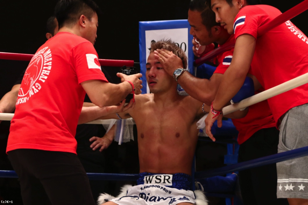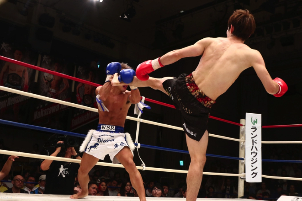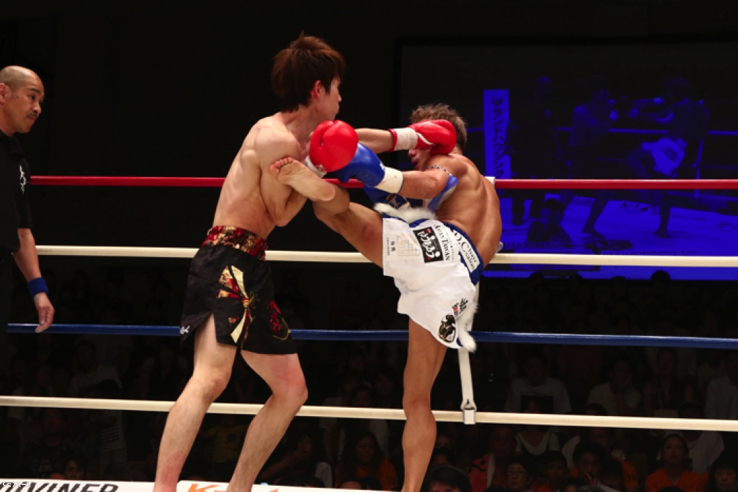 2R、出貝はムエタイ的でない一定でないリズムで前に出て、ジャブ・ストレートを当て隼也に鼻血を出させる。出貝は出ると思いきや行かず、バックステップしたりしてと隼也を戸惑わせる。出貝はバックブロー、前蹴りと攻撃が掴みどころがなく、隼也はロープに追い詰められる。