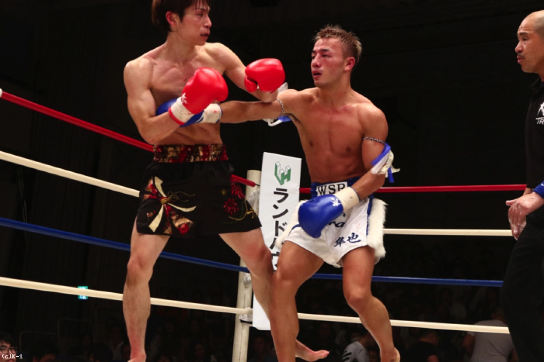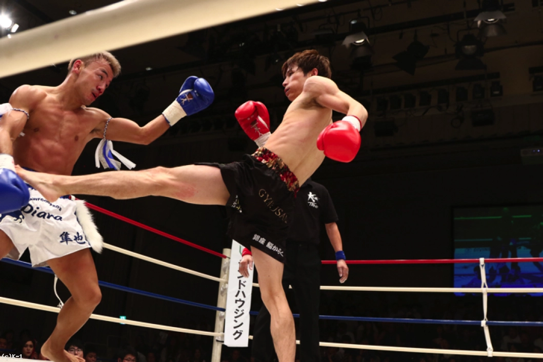 3R、左ミドルを放っていく隼也だが、出貝はこれに止められずやはり変則のリズムとタイミングで前に出て攻撃を仕掛ける。そして打ち下ろしの右クロスを決め、隼也の足を止める。上背で優る出貝は前に出て圧力を掛け、左ミドル、跳びヒザ、バックブローと攻めて試合を終える。判定は30-29(隼也)、29-29、29-29でドロー、延長戦で勝敗を決することとなる。