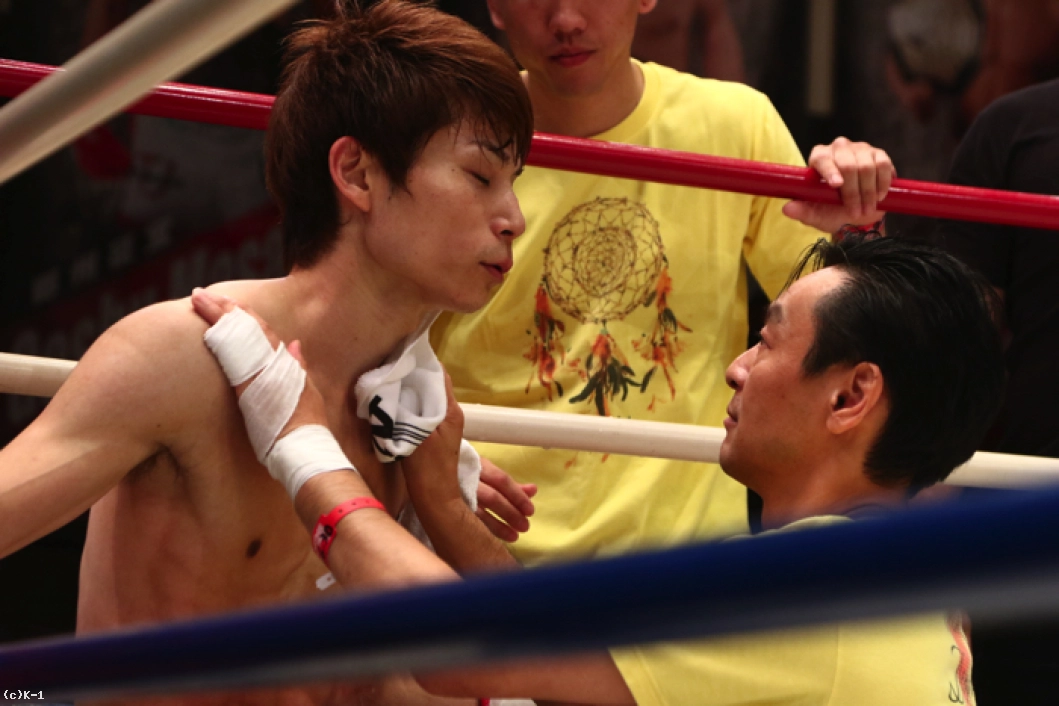 「(試合を振り返って?)思ったより身体の調子が悪くて、全然動けなくて。いつもの10\%くらいだったので、今回はダメでしたね。(対戦相手の印象は?)相手の作戦にハマッた中で戦っちゃったというか。キャリアがあるぶん、うまいなと思いました。(今日の大会ではバンタム級のタイトルマッチが行なわれるが?)いい勝ち方ができたら、勝った方とやらせてほしいって言いたかったんですけど……。もっともっと練習して強くなって、タイトルマッチをやりたいと思います」