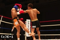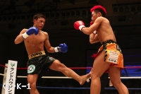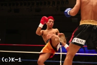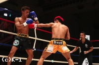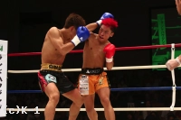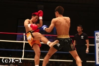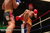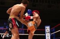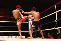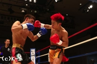 晃貴は2Rになると前進と圧力を強め、さらに桑田へローキックを当てる。スピードが印象的な晃貴のロー。ボディフックも桑田に重い音を響かせる。晃貴は右ローに加え左ローも繰り出しこれを桑田に効かせていく。桑田も左ミドルと右ストレートで盛り返しに掛かるが、これは晃貴の前蹴りに止められる。