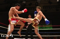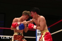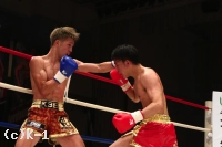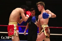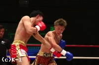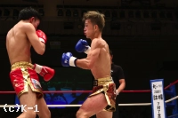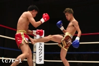 2R、玖村は跳びヒザ、左アッパー、ストレート、バックブローと勢いを落とさない。小倉はしかし鼻血を出しながらも右ローを連続で当て、右ストレートと左フックでも玖村をとらえていく。玖村は距離を作ってハイキックを打ち込むが、小倉はタフさと打たれ強さを見せ、左右フックをボディから顔面へと走らせる。