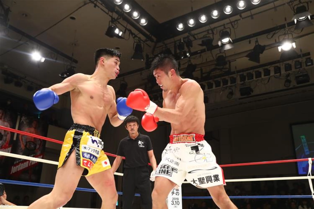 1R、牧平はサウスポースタイルから右の前蹴り、左ローを飛ばす。渡邊は牧平の蹴りを警戒しながら間合いを詰め、右ローを返す。しかし牧平は蹴りの間合いを作るとそれを崩さず、左ローを渡邊に浴びせる。やや効いた風の渡邊だったが、右フックを振るっていき逆にこれを渡邊に効かせる。そしてクリンチからのブレイクの後、再開すると渡邊は右フックを当て、牧平に尻もちをつかせダウンを奪う。