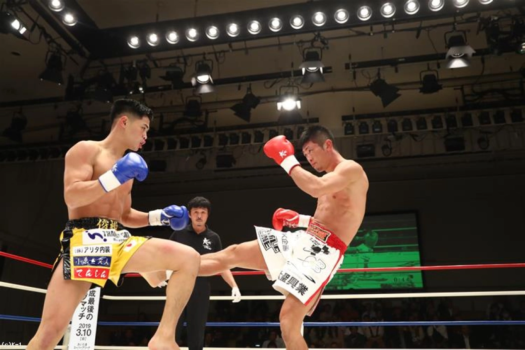 2R、左ミドルから入る牧平だが、渡邊は右ストレート、右フックと牧平に向かう。牧平は左ローだけでなく右ローも加え、そしてストレート、ボディへのヒザと渡邊に見舞う。ダメージでやや動きが落ちてくる渡邊。そこへ牧平は左ハイを打ち込みダウンを奪う。立ち上がった渡邊に牧平は左ストレートをヒット。さらに左ハイも再度見舞う。動きが緩慢になっている渡邊に牧平は跳びヒザ、ストレート、左ローと攻撃を散らしながら襲い掛かる。