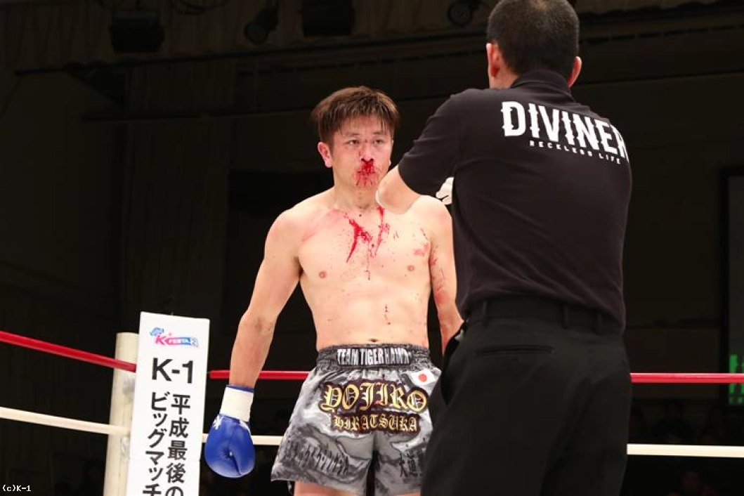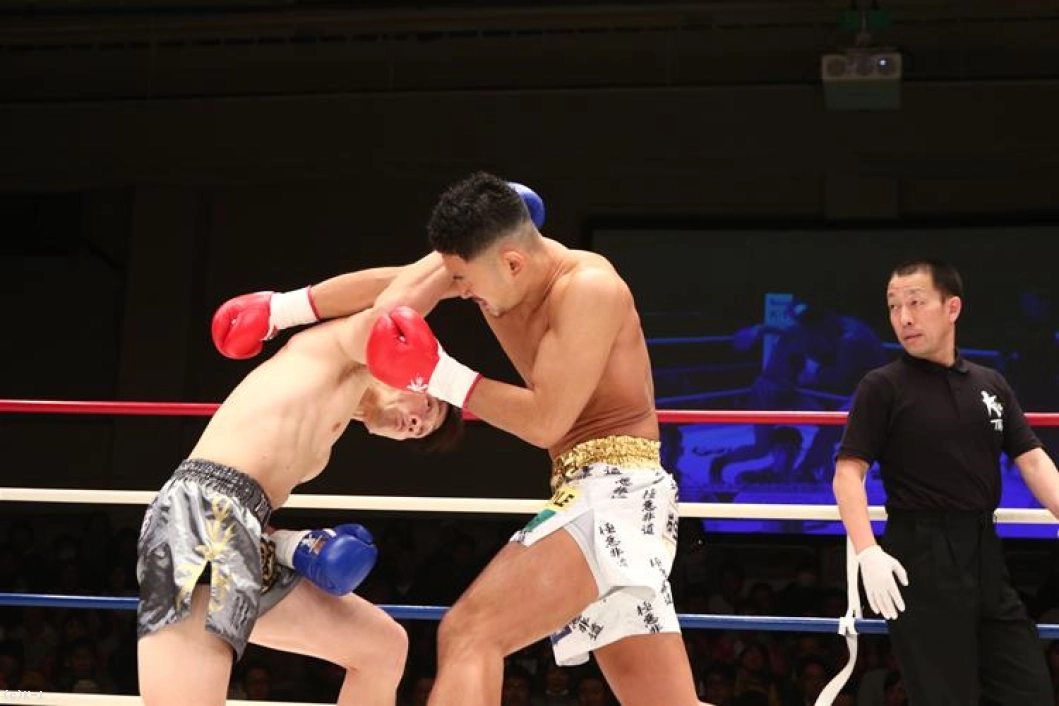 2R、平塚は1R同様左右に構えをスイッチしながら戦いを進める。神保は左インローからパンチを連係し、左ハイ、左インローとまず蹴りが当たり始める。そして続いてジャブ、左フック、右ストレートとパンチが平塚をとらえていく。この右ストレートで平塚の鼻柱から出血が見られ、ドクターチェックが行われる。