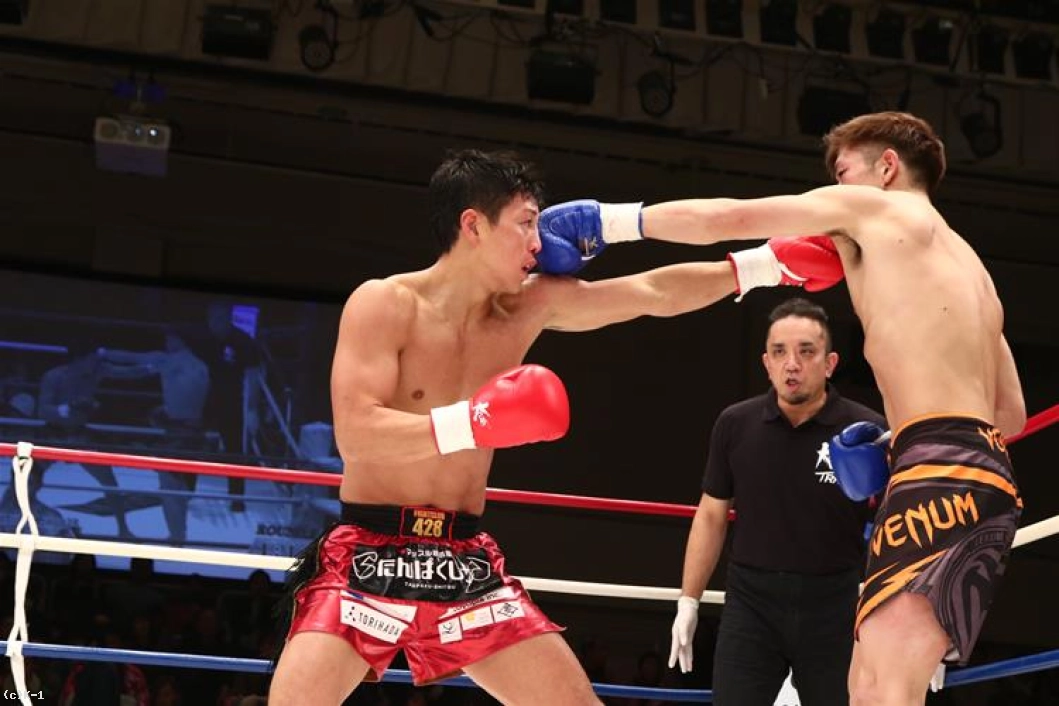 2R、久保は手を前に伸ばして前進し右ローを浴びせる。勇治はそこへ右アッパーを突き上げ、続いて左フックをフォローする。久保は右ローに加えて左右ボディフック。勇治もこれを押し返してボディヒザ、右ストレートで反撃するする。久保は右ストレートを当て返し再び前進。やはり勇治に対し押し勝っている印象だ。