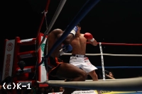 立ち上がったブラックドラゴンは左フック、大振りの右フックと反撃するが、逆に功也は左ストレート、跳びヒザとさらに攻める。そして終了直前右ハイキックを打ち込むとブラックドラゴンはストンと腰から落ちるようにダウン。だがブラックドラゴンが立ち上がり、1R終了となる。