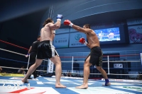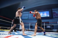 2R、開始から左ミドルで加藤が襲えば、上原は右ローを効かせて反撃。上原は右インローで加藤の右足内股をとらえ、赤く腫れ上がらせ追い詰めていく。またこのインローが結果的にストップの役割となり、加藤を前に来させない。